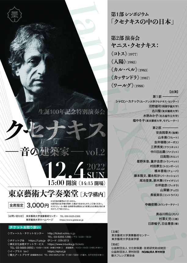 今年生誕100年を迎えるクセナキスが聴いたであろう「日本」を探る本公演では、前半は「クセナキスの中の日本」と題したパネルを通じてクセナキスの音楽から聴こえる「日本」の源泉に迫ります。後半は上述の二曲に加え、原初の叫びにも似た音が続くチェロ?ソロのための《コトス》、ディオニュソス祭の恍惚的熱狂を再現するような金管とパーカッションのための《カル?ペル》、そして運動と停滞の対照が印象的な《ワールグ》と、クセナキス独特の混沌とした音世界を体感していただきます。